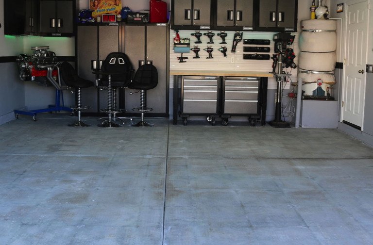In addition to extensive floor preparation, your garage atmosphere should be verified for air and floor temperature within the manufacturers’ recommended ranges before starting. For example, Rust-Oleum’s Epoxy shield needs an air temperature between 60 and 85 degrees with the floor being a minimum of 55-degrees Fahrenheit. If it’s too cold, it will not adhere correctly. Excessive heat can cause problems as well, giving you less time to work with the product to achieve a smooth finish.
